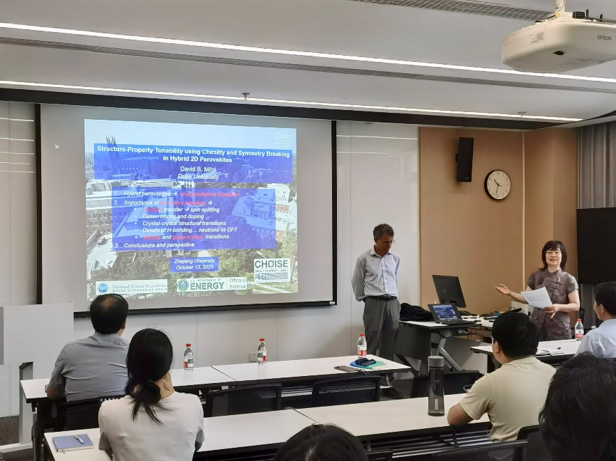 为积极响应2025高分子高质量发展大会的号召,2025年10月13日,国际知名材料科学家、美国杜克大学David B. Mitzi教授应浙江大学陈红征教授邀请莅临我校进行学术交流。Mitzi教授在紫金港校区高分子楼231报告厅作了题为"Structure-Property Tunability using Chirality and Symmetry Breaking in Hybrid 2D Perovskites"的前沿学术报告,系统阐述了手性调控与对称性破缺在杂化二维钙钛矿结构-性能调控领域的最新研究进展。本次学术活动由浙江大学高分子科学与工程学系(硅及先进半导体材料全国重点实验室)陈红征教授主持,金一政教授、吴刚教授、薛晶晶研究员、朱海明研究员、王勇研究员、左立见研究员、傅伟飞研究员、以及来自高分子系、材料学院、化学系、杭州国际科创中心和西湖大学等师生出席了报告会 。