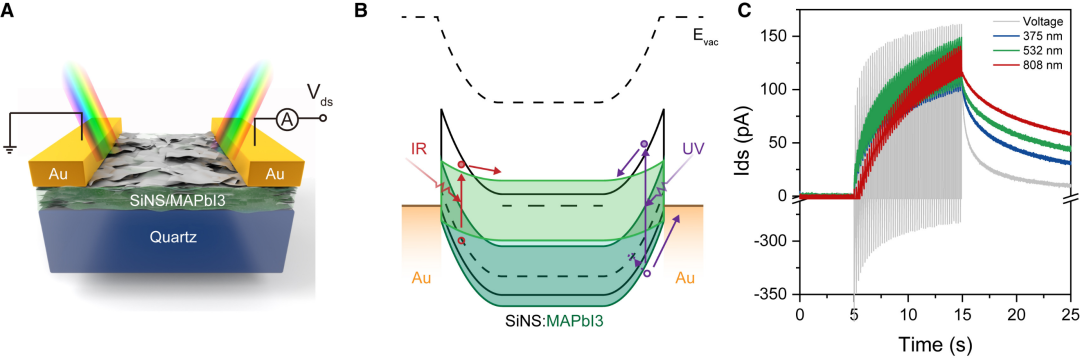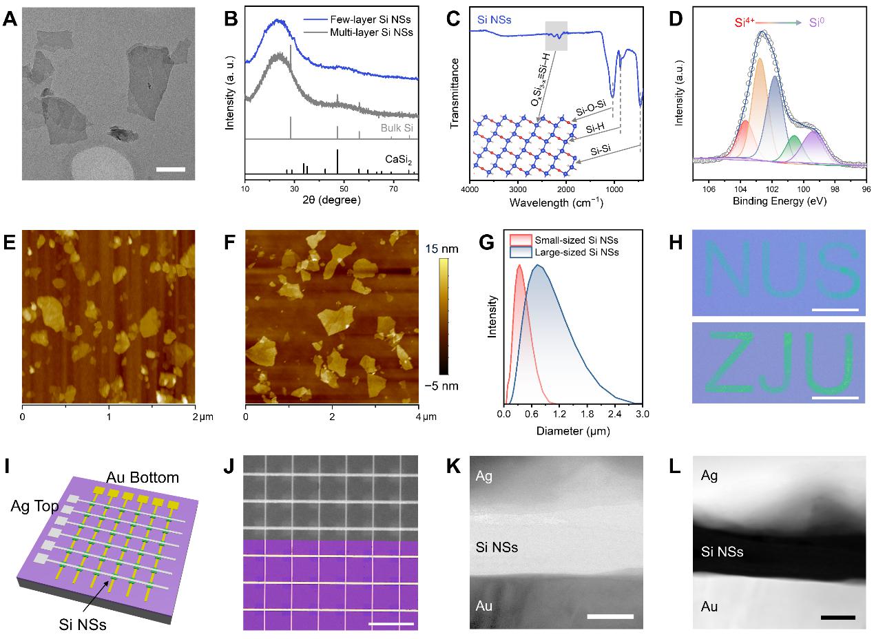 然而,传统的硅基CMOS技术往往难以以紧凑和节能的方式复制神经形态特征。新兴材料如铁电材料、钙钛矿材料、二维(2D)材料等,虽然被应用于忆阻器件,但往往存在CMOS兼容性差和生产成本高的问题。此外,两种类型(易失性和非易失性)忆阻器所用材料的差异也带来了加工复杂性和潜在的集成障碍。硅纳米片(Si NSs)是块状硅的层状薄结构,具有与块状硅不同的物化特性,同时与成熟的硅基工艺具有潜在的兼容性。与SiO2或块状晶体硅相比,Si NSs独特的2D结构提供了丰富的性能可调性,使其成为下一代电子的应用平台。