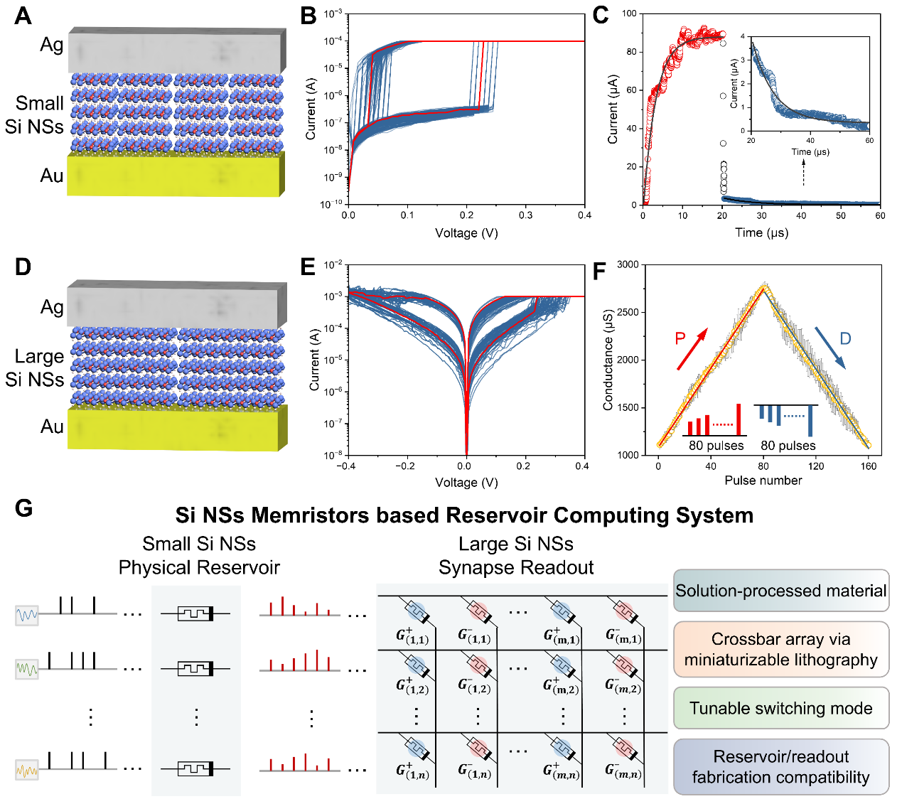 Si NSs忆阻器表现出易失性或非易失性开关行为,由纳米片的横向尺寸调节。小尺寸的Si NSs具有低设定电压(0.23 V)、对电压脉冲的非线性瞬态响应、4位顺序输入的可区分输出等特点,适合储层使用。相比之下,大尺寸的Si NSs具有非易失性模拟RS行为,超低的设置/复位电压(0.24 V/−0.18 V),电导更新的良好线性度,以及稳定的电阻保留时长,可以用作读出层的突触。包括导电原子力显微镜(C-AFM)和密度泛函理论(DFT)计算在内的物理分析表明,Si NSs中的边缘缺陷促进了Ag+的层间扩散,调节了导电丝的动力学并产生了双模式切换行为。利用这种独特的双模式功能,我们实现了基于Si NSs忆阻器的集成储层计算处理器,该处理器在时间数据处理方面具有很高的准确性,并通过MNIST手写数字识别和二阶非线性动力学预测得到了验证。这项工作为实现基于硅的技术实现紧凑和节能的时间处理器开辟了一条有希望的途径。