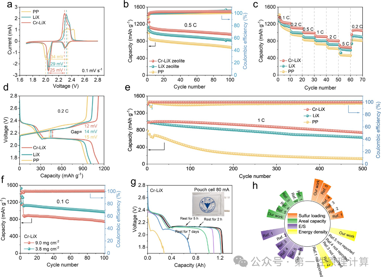 图5. a) 使用不同隔膜的锂硫电池在0.1 mV s⁻¹下的CV曲线,b) 使用不同隔膜的锂硫电池在0.5C下的循环性能,c) 使用不同隔膜的锂硫电池在不同倍率下的倍率性能,d) 使用不同隔膜的锂硫电池在0.2C下的充放电曲线,e) 使用不同隔膜的锂硫电池在1C下的长循环性能,f) 使用Cr-LiX改性隔膜的锂硫电池在3.8和9 mg cm⁻²高硫载量下于0.1C的循环性能,g) 使用Cr-LiX改性隔膜的软包电池性能,h) 本工作与其他工作的性能对比。