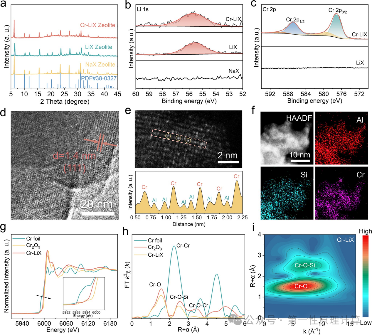图1. a) NaX、LiX和Cr-LiX的XRD图谱,b) Li 1s和c) Cr 2p的高分辨率XPS谱,d) Cr-LiX的HRTEM图像,e) Cr-LiX的AC-STEM及线扫描剖面,f) Cr-LiX的元素分布图,g) Cr-LiX与Cr参比物的Cr K边XANES谱,h) Cr-LiX与Cr参比物的R空间EXAFS谱,i) Cr-LiX的Cr K边EXAFS小波变换。