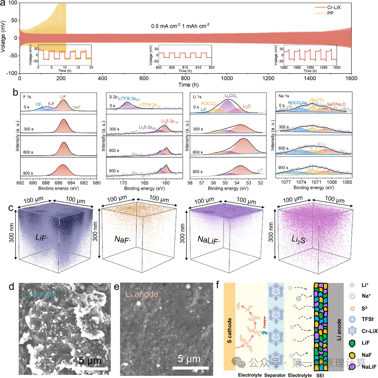 图4. a) 使用PP和Cr-LiX改性隔膜的Li//Li对称电池在0.5 mA cm⁻²下的循环性能,b) 循环后锂负极表面在不同刻蚀深度下的XPS谱,c) 循环后使用Cr-LiX改性隔膜的锂硫电池中锂负极的ToF-SIMS分析,循环后使用d) PP和e) Cr-LiX改性隔膜的锂硫电池中锂负极的SEM图像,f) Cr-LiX在锂硫电池循环过程中功能作用的示意图。