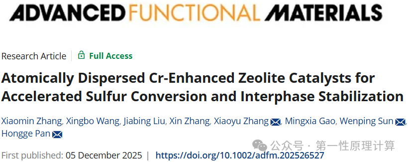 锂硫(Li-S)电池的应用受到正极的穿梭效应与硫转化动力学迟滞,以及锂负极界面不稳定性的严重制约。催化剂设计和构建稳定的固体电解质界面(SEI)是克服这些挑战的关键策略。2025年12月5日,浙江大学/硅及先进半导体材料全国重点实验室潘洪革(国家杰青/长江学者)、浙江大学孙文平(国家杰青)团队在Advanced Functional Materials期刊发表题为“Atomically Dispersed Cr-Enhanced Zeolite Catalysts for Accelerated Sulfur Conversion and Interphase Stabilization”的研究论文,浙江大学Zhang Xiaomin为论文第一作者,潘洪革、孙文平、浙江工业大学张萧玉为论文共同通讯作者。