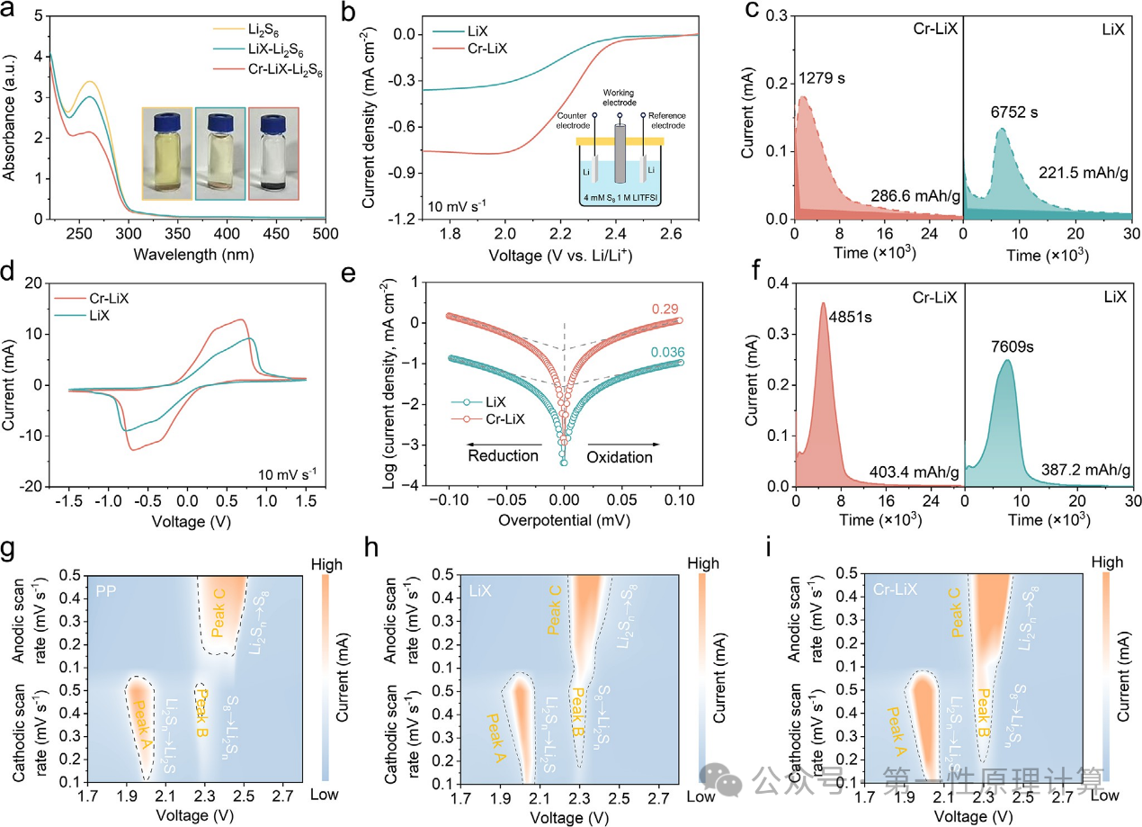 图2. a) 不同样品吸附Li₂S₆的视觉吸附实验与紫外-可见光谱,b) LiX与Cr-LiX催化剂还原S₈的LSV曲线,c) Cr-LiX和LiX电极的Li₂S成核测试与f)去核测试,d) 基于Cr-LiX和LiX电极的对称电池CV曲线及e)对应的LSV曲线,g–i) 使用不同隔膜的锂硫电池在不同扫速下CV曲线的等高线图。