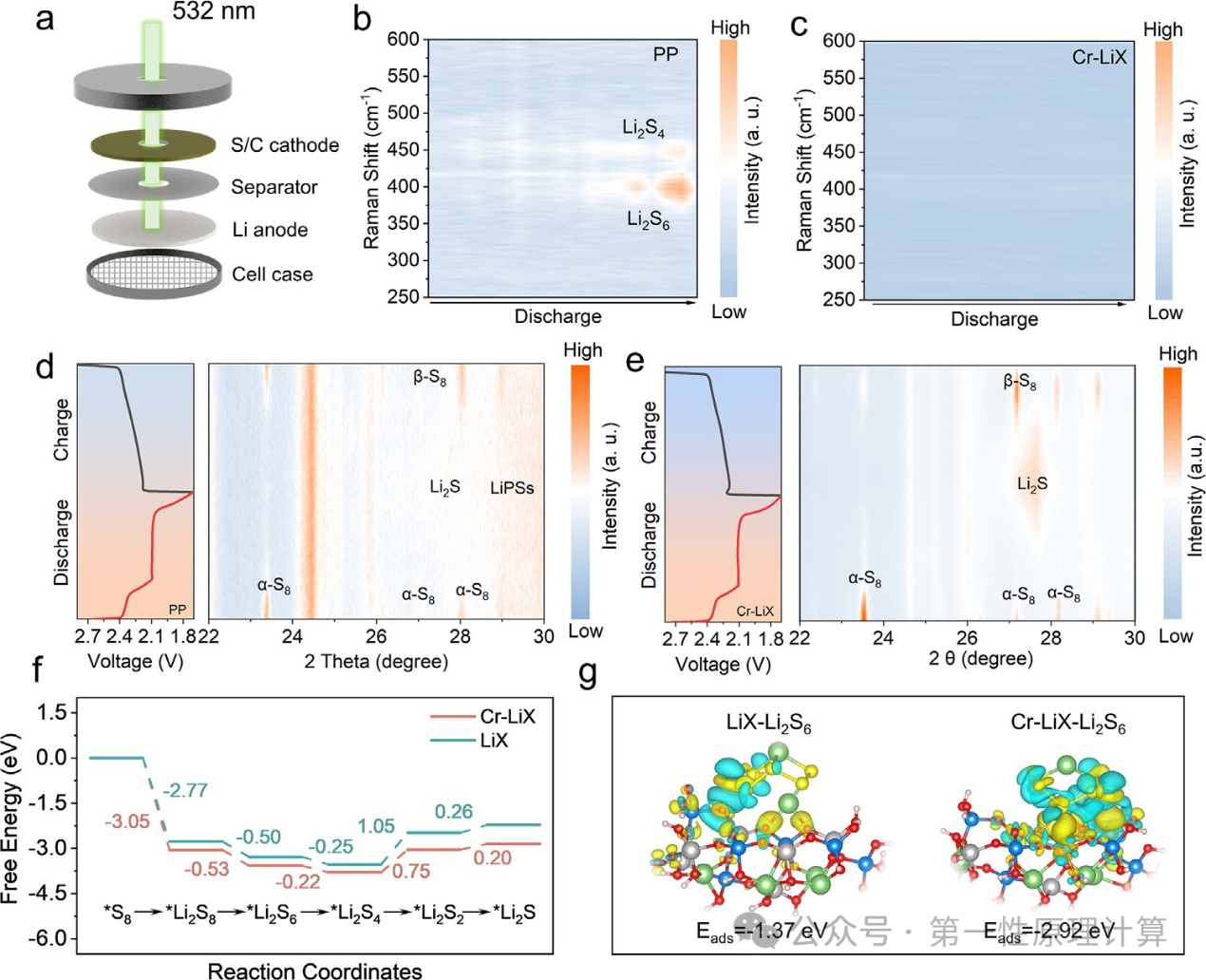图3. a) 原位拉曼测试示意图,使用b) PP隔膜和c) Cr-LiX改性隔膜的锂硫电池原位拉曼测试,使用d) PP隔膜和e) Cr-LiX改性隔膜的锂硫电池原位XRD及对应充放电曲线,f) S₈还原的吉布斯自由能计算,g) LiX-Li₂S₆与Cr-LiX-Li₂S₆的差分电荷密度和结合能。