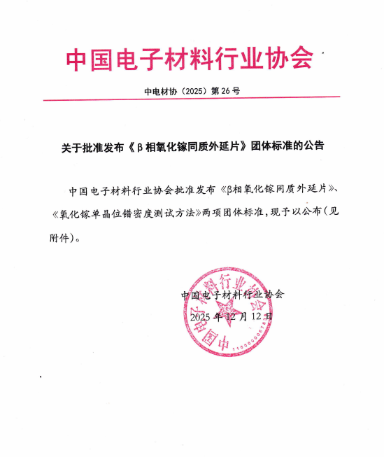 近日,由实验室孵化企业杭州镓仁半导体有限公司牵头的《β相氧化镓同质外延片》(T/CEMIA 050-2025)与《氧化镓单晶位错密度测试方法》(T/CEMIA 051-2025)两项团体标准,经中国电子材料行业协会批准正式发布,将于2026年1月1日起全面实施。这是我国在第四代半导体材料领域标准化建设的重大突破,标志着氧化镓产业从技术研发向规模化应用迈出关键一步。